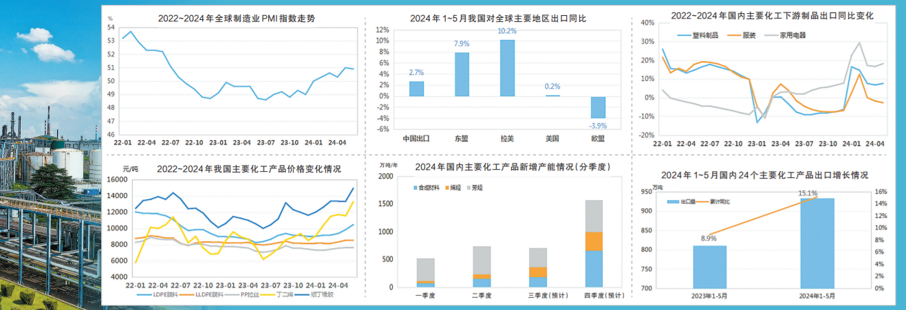 與此同時(shí),全球制造業(yè)回暖,在海外補(bǔ)庫(kù)存需求的提振下,產(chǎn)品出口增長(zhǎng)逐步恢復(fù)。6月,全球制造業(yè)PMI為50.9%,連續(xù)5個(gè)月位于擴(kuò)張區(qū)間,美國(guó)多數(shù)行業(yè)進(jìn)入補(bǔ)庫(kù)存階段,全球貿(mào)易景氣度明顯改善。今年1~5月,我國(guó)出口總值(以美元計(jì))同比增長(zhǎng)2.7%,增速較去年同期提升4.1個(gè)百分點(diǎn),其中,對(duì)東盟、拉美等新興經(jīng)濟(jì)體的出口量高于對(duì)美國(guó)、歐盟等發(fā)達(dá)經(jīng)濟(jì)體的出口量,與化工產(chǎn)品相關(guān)的塑料制品、服裝、家用電器等產(chǎn)品出口觸底回升,24個(gè)主要化工產(chǎn)品累計(jì)出口932.8萬(wàn)噸,同比增長(zhǎng)15.1%。